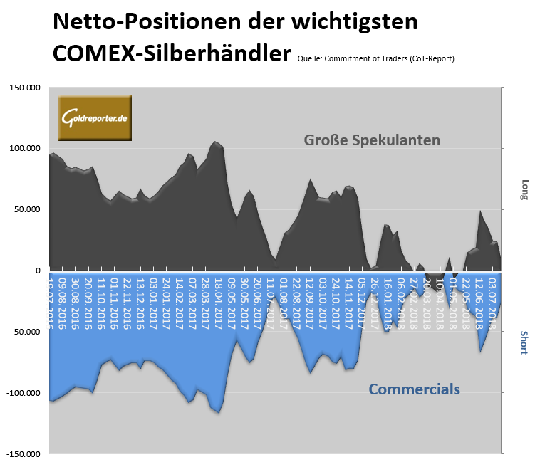 Die jüngsten CoT-Zahlen vom Handel mit Silber-Futures an der US-Warenterminbörse COMEX zeigen per 17. Juli 2018 außergewöhnliche Veränderungen in den Positionen der größten Händlergruppen.