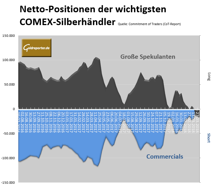 Per 3. April 2018 ist die Netto-Short-Position der „Commercials“ um 64 Prozent auf nur noch 2.637 Kontrakte zurückgegangen. Die „Swap Dealers“ haben ihre Netto-Käufe dabei noch einmal um knapp 11 Prozent auf 21.797 Kontrakte ausgebaut. Das heißt, sie stehen nun mit umgerechnet 3.389 Tonnen Silber auf der Käuferseite. Denn jeder Kontrakt repräsentiert 5.000 Unzen Silber.