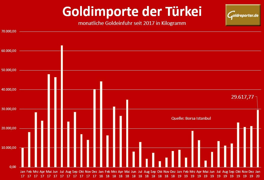 Schon in den vergangenen vier Monaten importierte die Türkei jeweils mehr als 20 Tonnen Gold. Die Türkei zählt regelmäßig zu den Top-5 der Länder mit der weltweit größten Goldnachfrage. Dazu gehört vor allem Goldschmuck. Aber auch die private Investmentnachfrage hat in den vergangenen Jahren zugenommen. Siehe auch: Türkei verkaufte riesige Menge an Goldmünzen in 2019