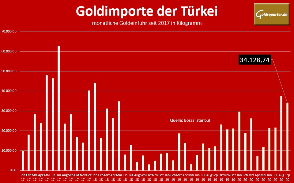 Auf hohem Niveau befinden sich weiterhin auch die Silberimporte. Hier verzeichnet man für September mit 67,24 Tonnen die zweithöchste Einfuhr in diesem Jahr. Im starken Vormonat waren es 102 Tonnen. Im November 2019 waren offiziell nur 23,3 Tonnen Silber in die Türkei gelangt. Mit insgesamt 406 Tonnen liegen die Silberimporte der Türkei im bisherigen Jahresverlauf doppelt so hoch wie im 9-Monats-Zeitraum von 2019 (202 Tonnen).