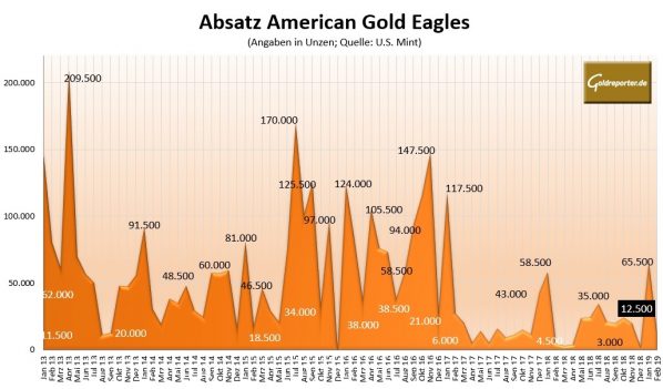 Im Vorjahresvergleich hat sich der Goldabsatz mehr als verdoppelt. Allerdings war der Februar 2018 mit nur 5.500 Goldunzen extrem schwach ausgefallen.