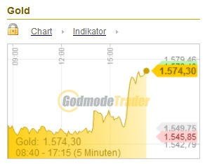 Nach 16 Uhr MESZ stieg der Goldpreis am Spotmarkt von Kursen knapp unterhalb der Marke von 1.550 Dollar um mehr als 20 Dollar auf zeitweise 1.575 Dollar. Da der Euro-Dollar-Kurs sich kaum von Notierungen um 1,27 Dollar löste, stieg auch der in Euro gerechnete Goldpreis kräftig an. Gegen 17 Uhr ließ sich ein Goldpreis von 1.236 Euro pro Feinunze ableiten. Vortags hatte der Euro-Goldkurs die Marke von 1.200 Euro geschrammt. Silber legte ebenfalls stark zu. Der Kurs des weißen Edelmetalls eroberte kurzfristig das Niveau von 28 Dollar zurück.