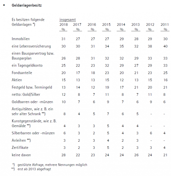 Gegenüber Vorjahr gestiegen sind aber auch der Immobilienbesitz (31 %, +4 Prozentpunkte), Aktienbesitz (15 %, +2 Pkte.) und der Besitz von Fondsanteilen (20 %, + 3 Pkte.). Darüber hinaus haben auch Tagesgeld (25 %; +3 Pkte.) und Antiquitäten an Bedeutung gewonnen (8 %; +4 Pkte.).