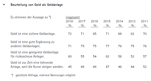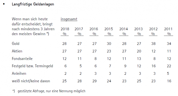 Allerdings sind die Kurserwartungen zurückgegangen. 45 Prozent stimmten der Aussage zu, dass Gold zur Zeit eine lohnende Anlage sei, „weil die Kurse steigen werden“. Im Vorjahr gab es hier noch von 49 Prozent der Befragten eine Zustimmung. Immerhin: Gold wird mit 28 Prozent Zustimmung nach mindestens 3 Jahren der meiste Gewinn zugetraut – noch vor Aktien (27 %).