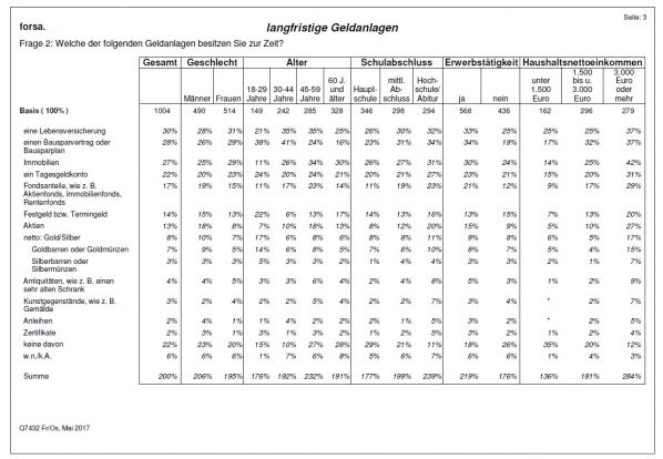 Welche Kapitalanlage verspricht die höchsten Gewinne innerhalb eines Zeitraums von mindestens drei Jahren? Was haben die Befragten selbst im Depot? Wie wird Gold in Sachen Geldanlage allgemein beurteilt? Dies sind die Kernthemen, zu denen 1.004 in deutschen Privathaushalten lebende deutschsprachige Personen ab 18 Jahre vom 15. bis 19. Mai 2017 in computergestützten Telefoninterviews befragt wurden.
