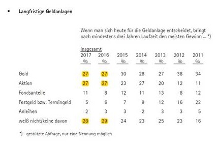 • Gold und Aktien werden mit einer Zustimmung von jeweils 27 Prozent die größten Gewinnchancen zugetraut (gleiches Ergebnis wie 2016)