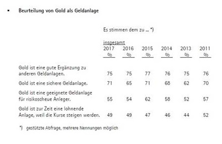 In der jungen Zielgruppe (18 bis 29 Jahre) gibt es allerdings die größte Gewinnerwartung. 58 Prozent stimmten der Aussage zu, „Gold ist zur Zeit eine lohnende Anlage, weil die Kurse steigen werden“. In der Altersgruppe 45 bis 59 Jahre stimmten 54 Prozent zu. Bei den über 60-jährigen nur 43 Prozent.
