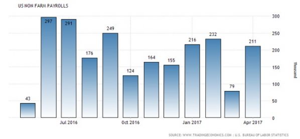 Das U.S. Bureau of Labor Statistics hat am Freitagnachmittag die offiziellen Arbeitsmarktzahlen für den Monat April veröffentlicht. Demnach wurden im vergangenen Monat 211.000 neue Jobs außerhalb der Landwirtschaft geschaffen. Der Konsens unter Analysten hatte bei 185.000 neuen Stellen gelegen. Die Zahlen vom Vormonat wurden allerdings von 98.000 auf 77.000 revidiert. Die US-Arbeitslosenquote für April wird mit 4,4 % beziffert, nach 4,5 % im Vormonat. Mehr