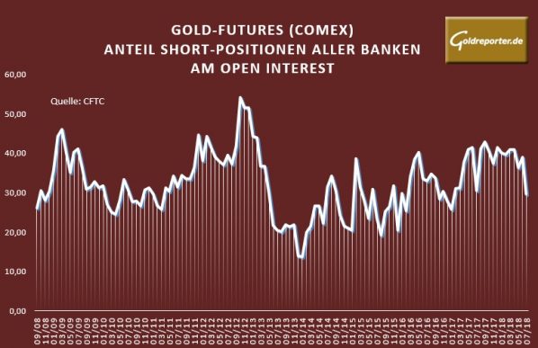 Und auch die Netto-Short-Position aller Banken zusammengenommen (US-Banken und Nicht-US-Banken) sank gegenüber Vormonat um 26,5 Prozent auf 97.657 Kontrakte. Der Anteil der Short-Positionen aller Banken am Open Interest sank von 39 Prozent auf zuletzt 29,7 Prozent (rote Grafik).