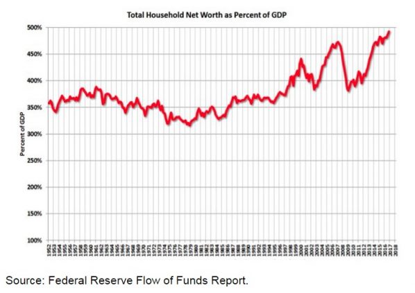 Im gleichen Zeitraum hat das nominale Bruttoinlandsprodukt der Vereinigten Staaten um 4,766 Billionen US-Dollar von 14,090 Billionen US-Dollar auf 18,856 Billionen US-Dollar zugenommen. Es ist also lediglich um 33 Prozent gestiegen. Das heißt gleichzeitig, die US-Vermögen gemessen am US-Bruttoinlandsprodukt sind von 388 Prozent auf den Rekordwert von zuletzt 492 Prozent des BIP nach oben geschnellt.