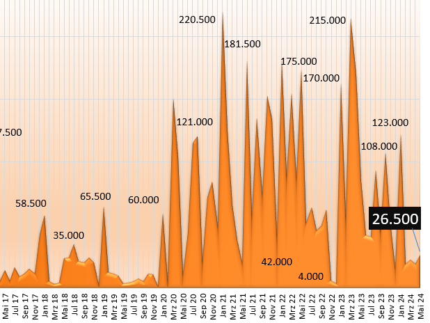 Währenddessen meldet die U.S. Mint auch verhaltene Silber-Absatzzahlen. Denn für Mai werden 1.748.000 Unzen an Verkäufen ausgewiesen. Somit sank die Absatzmenge um 30 Prozent gegenüber Vormonat. Dagegen ergibt sich im Vorjahresvergleich eine Steigerung um 9 Prozent. Und die 5-Monats-Zahlen liegen mit 12.550.000 Unzen immerhin 52 Prozent über dem (sehr schwachen) Vorjahr.