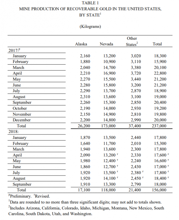 Im Zeitraum von Januar bis September summierte sich die Goldproduktion in den USA auf 156 Tonnen. Auch für diesen Zeitraum liegen die Zahlen 12 Prozent unter Vorjahr.