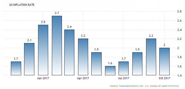 Die offizielle Inflationsrate in den Vereinigten Staaten ist im vergangenen Monat wieder gesunken. Im Oktober lag die jährliche Teuerung der US-Konsumentenpreise bei 2,0 Prozent. Im Vormonat waren es noch 2,2 Prozent. Die Kerninflationsrate stieg leicht um 0,1 Punkte auf 1,8 Prozent. Mehr