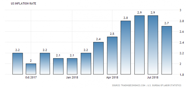 Die offizielle US-Inflationsrate betrug im vergangenen August 2,7 Prozent. Das ist der niedrigste Wert seit April 2018. Im Vormonat hatte die Inflation noch bei 2,9 Prozent gelegen. Analysten hatten für August mit 2,8 Prozent gerechnet. Die Kerninflationsrate ging von 2,5 Prozent im Vormonat auf 2,2 Prozent zurück. Vor allem die Preise für Energie sind weniger stark gestiegen als zuletzt. Die höchste jemals in den USA (im 20. Jhdt.) gemessene Inflation wird mit 23,7 Prozent beziffert (Juni 1920). Das Rekordtief lag bei -15,8 Prozent im Juni 1921. Mehr