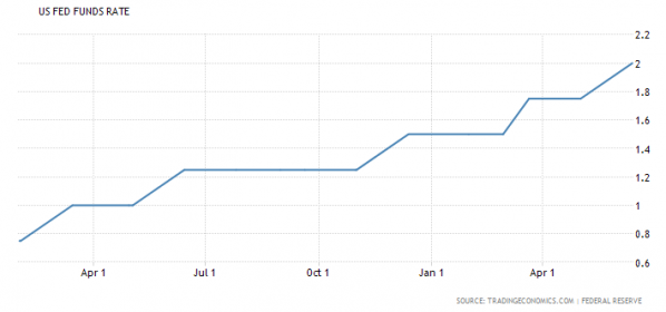 Die US-Notenbank hat im Rahmen ihrer jüngsten Sitzung eine Anhebung des amerikanischen Leitzinsen bekanntgegeben. Die Federal Funds Rate steigt um 25 Basispunkte auf 1,75 % bis 2,00 %. Dieser Schritt war von Analysten erwartet worden. Es ist die fünfte Erhöhung des US-Leitzinses seit Dezember 2016. Mehr