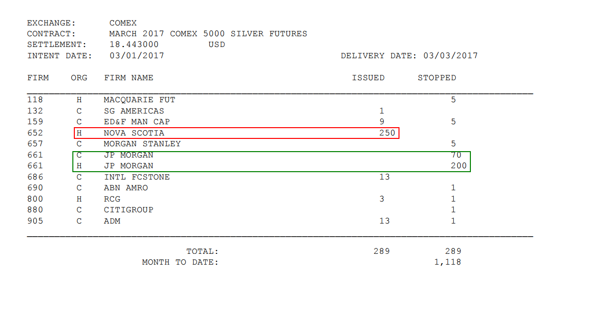 und heute lieferte Nova Scotia 397 Silber-Kontrakte (1.985.000 Unzen Silber) zum Preis von $18,42 an JPM.