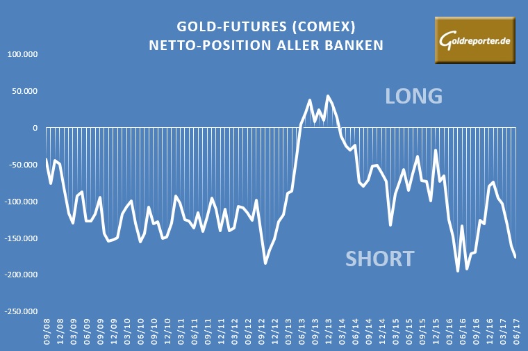 Per vergangenem Dienstag hat die Netto-Short-Position der Banken im Gold-Futures-Handel an der US-Warenterminbörse COMEX den höchsten monatlichen Wert seit Juli 2016 erreicht.