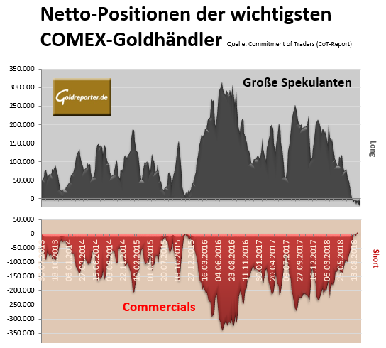 Die aktuellen CoT-Daten vom Handel mit Gold-Futures an der US-Warenterminbörse COMEX weisen per 25.09.2018 folgende Veränderungen in den Positionen der bedeutendsten Händlergruppen aus.