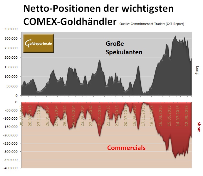 Die Netto-Short-Position der „Commercials“ ist gegenüber Vorwoche um 7,52 Prozent auf 217.599 (Futures-)Kontrakte angestiegen. Das ist der Stand per 25. Oktober 2016, also vergangenen Dienstag.