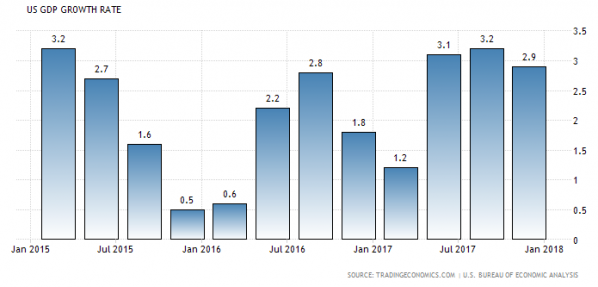 Am heutigen Nachmittag wurde die dritte Schätzung des US-Wirtschaftswachstums im vierten Quartal 2017 veröffentlicht. Mit einem Plus von 2,9 Prozent gegenüber Vorjahr ist das Ergebnis gegenüber der zweiten Schätzung um 0,4 Prozentpunkte nach oben revidiert worden. Analysten hatte mit einer Revision um verbesserte 0,2 Prozentpunkte gerechnet. Gegenüber den beiden vorangegangenen Quartalen fiel das BIP-Wachstum der Vereinigten Staaten aber weiterhin geringfügig schwächer aus. Mehr