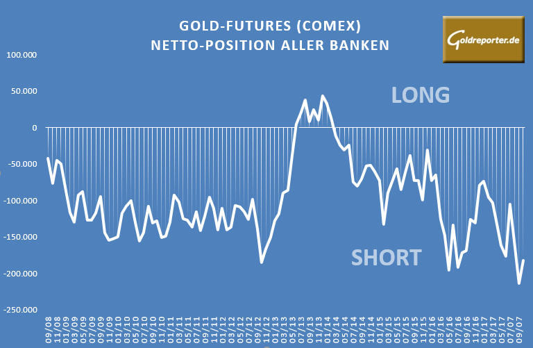 Die US-Banken verringerten ihre Short-Position bei Gold um ebenfalls 15 Prozent auf 108.444 Kontrakte.