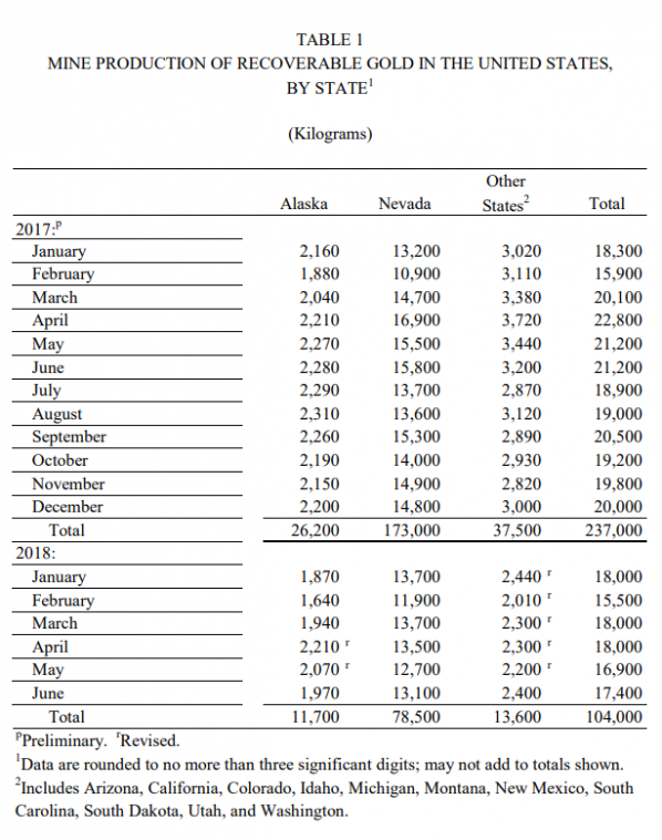Im Zeitraum von Januar bis Juni belief sich die US-Fördermenge laut USGS auf 104 Tonnen Gold. Zum gleichen Zeitpunkt des Vorjahres waren es 119,5 Tonnen. Die 6-Monats-Zahlen liegen somit 13 Prozent unter Vorjahr.