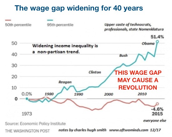 Schauen Sie sich die Grafik an. Sie zeigt das wachsende Lohngefälle in den USA zwischen den obersten 5 % und den oberen 50 % seit 1973. Bei der Spitzengruppe sehen wir einen Anstieg um 51 %, die mittlere Gruppe hingegen hat ein Minus von 4 % zu verbuchen. Das ist der Stoff, aus dem Revolutionen entstehen – und soziale Unruhen gehören eindeutig zu jenen Unsicherheiten, auf die wir vorbereitet sein müssen.
