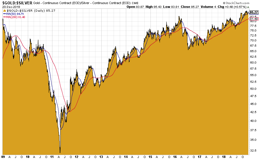 Gold-Silber-Ratio, 21.12.2018. Mit Werten über 85 wurden zuletzt erneut extrem hohe Notierungen erreicht.