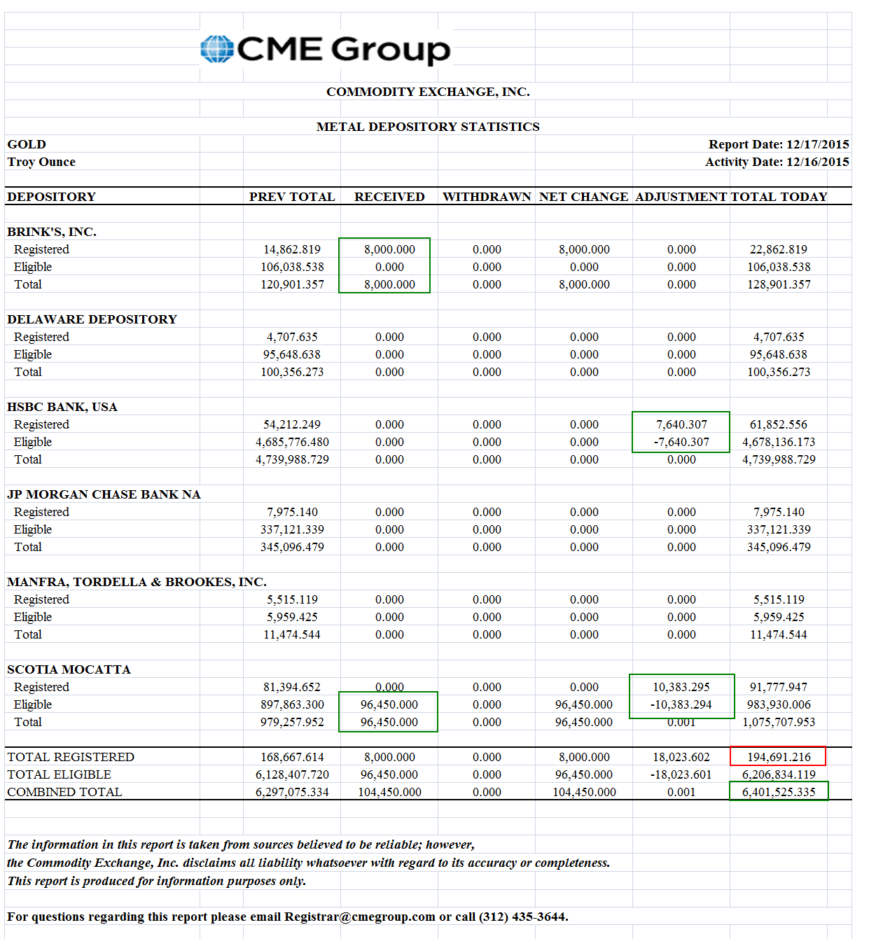 Interessant ist, daß der Bestand von „registered“ Goldunzen bei JPM seit 4 Wochen konstant ist: 7.957 Unzen – ein eindeutiger Hinweis darauf, daß die Kunden von JPM per Cash-Settlement (+ Schweige-Prämie wegen aktueller Tiefstpreise?) abgefertigt werden.