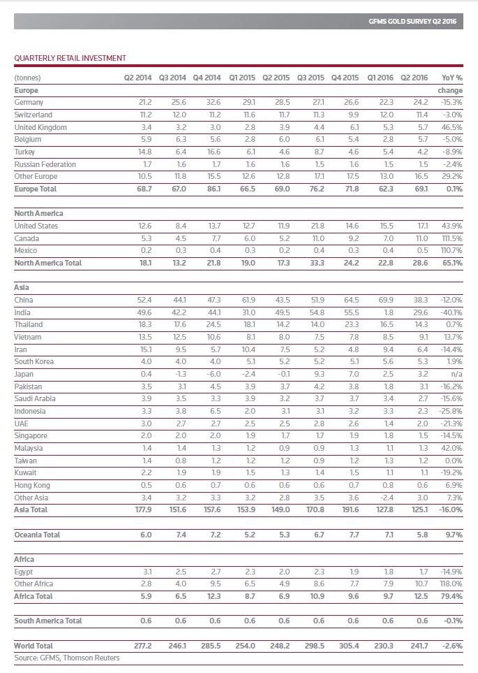 In Deutschland wurden im 2. Quartal 2016 24,2 Tonnen Gold in Form von Münzen und Barren nachgefragt. Gegenüber Vorjahr ging die deutsche Anlagegold-Nachfrage damit um 15,3 Prozent zurück. Im Vergleich zum Vorjahr hat Deutschland 8,5 Prozent mehr physisches Gold nachgefragt.
