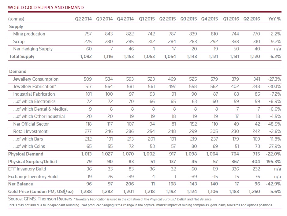 Gegenüber dem Vorjahresquartal fiel die weltweite Goldnachfrage um 22 Prozent. Verglichen mit dem Vorquartal betrug das Minus 6,4 Prozent. Das Goldangebot nahm gegenüber Q2 2016 um 6,2 Prozent zu, ging aber gegenüber Vorquartal um 1 Prozent zurück.