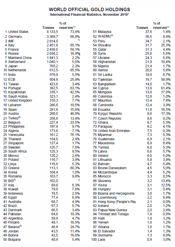 Der World Gold Council (WGC) hat eine neue Rangliste der weltweiten Goldreserven veröffentlicht. Darin enthalten sind die offiziellen nationalen Goldbestände per August/September 2018. Folgende Veränderungen haben sich gegenüber der WGC-Tabelle des Vormonats ergeben.