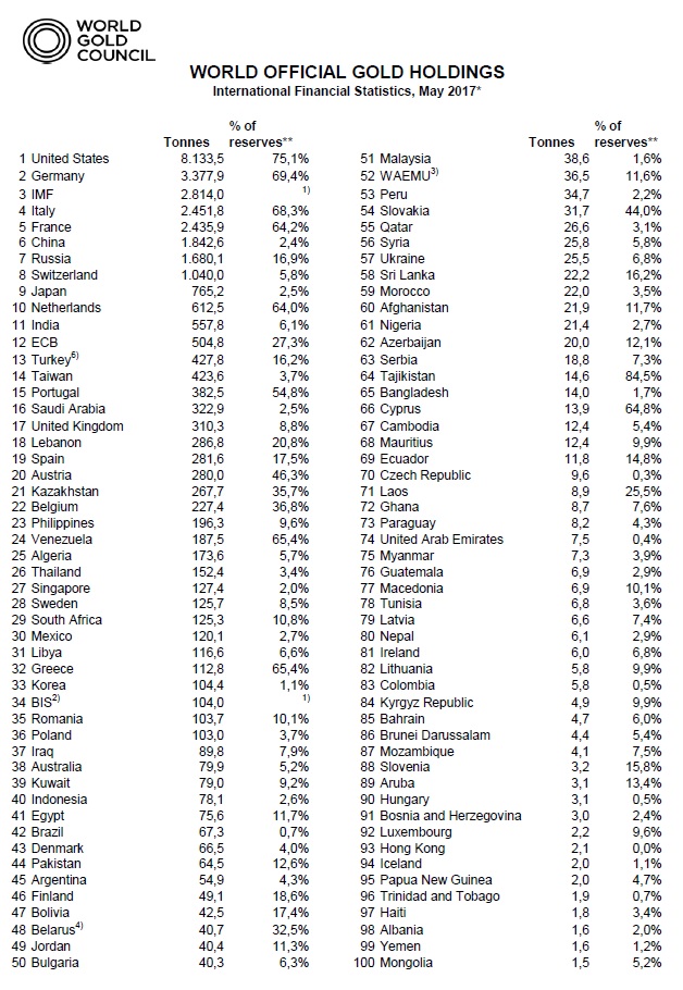 Weltweite Goldreserven 05-2017