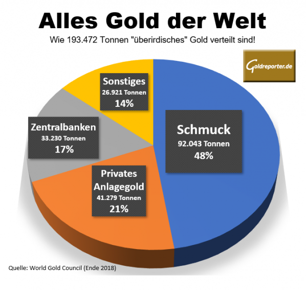 Rund die Hälfte des Goldes (47,6 %) wurde zu Schmuck verarbeitet. Das macht 92.043 Tonnen. Die weltweiten Goldreserven belaufen sich laut WGC auf 33.230 Tonnen (17,2 Prozent der Goldmenge). Anlagegold in Privathand wird mit 41.279 Tonnen taxiert (17,2 %). Und der Rest (26.921 Tonnen) des überirdischen Goldes wird unter „sonstiges“ verbucht. Als noch erreichbare (abbaubare) Reserven gelten derzeit 54.000 Tonnen.