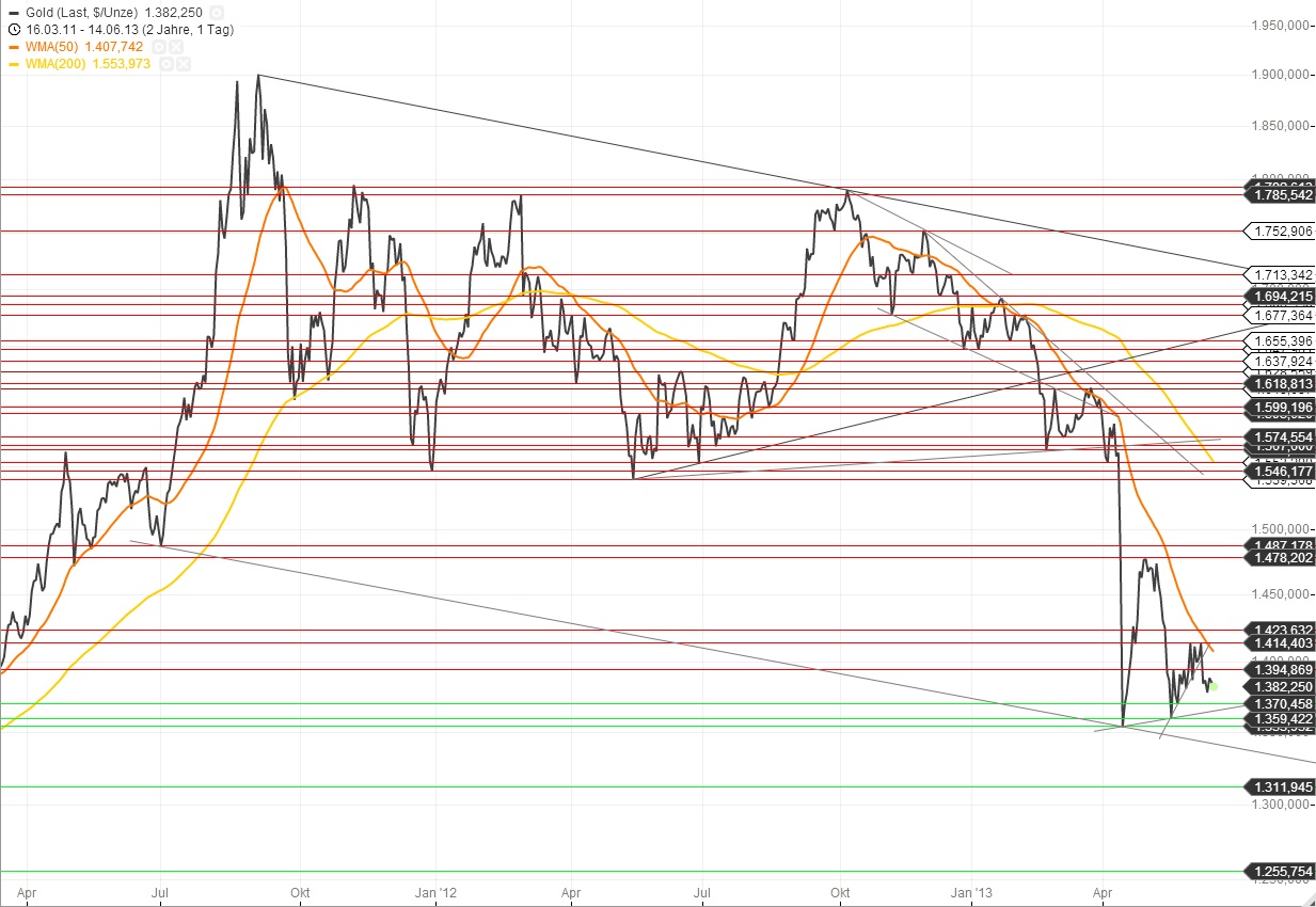 Mit diesem Kursrutsch stieg erneut die Wahrscheinlichkeit für ein erneutes Absacken in die Nähe des Jahrestiefstkurses bei 1.353 Dollar. Als mögliches Szenario wäre sogar ein nochmaliger Abverkauf mit neuen Jahrestiefstkursen denkbar, der den Chart bis an das untere Ende des breiten Abwärtstrendkanals heranführt.