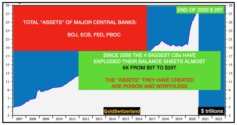Wie man im Diagramm oben sehen kann, sind die Bilanzen dieser Zentralbanken seit 2006 um das 6-fache explodiert. 2008-09 lag die gemeinsame Bilanzsumme noch bei 9 Billionen $, heute sind es 29 Bill. $.