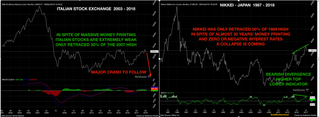 Auch für die meisten anderen Weltmärkte sieht das Bild ähnlich aus. Kanada, England, Deutschland, Japan und viele mehr. Alle markierten Hochs im Januar, die auf wöchentlichen und monatlichen Charts von Momentum-Indikatoren nicht bestätigt werden konnten. Dies ist normalerweise ein sehr bärisches Zeichen und ein starkes Signals, dass der Stimulus, den die Zentralbanken um die ganze Welt verabreicht haben, keine Wirkung mehr hat.